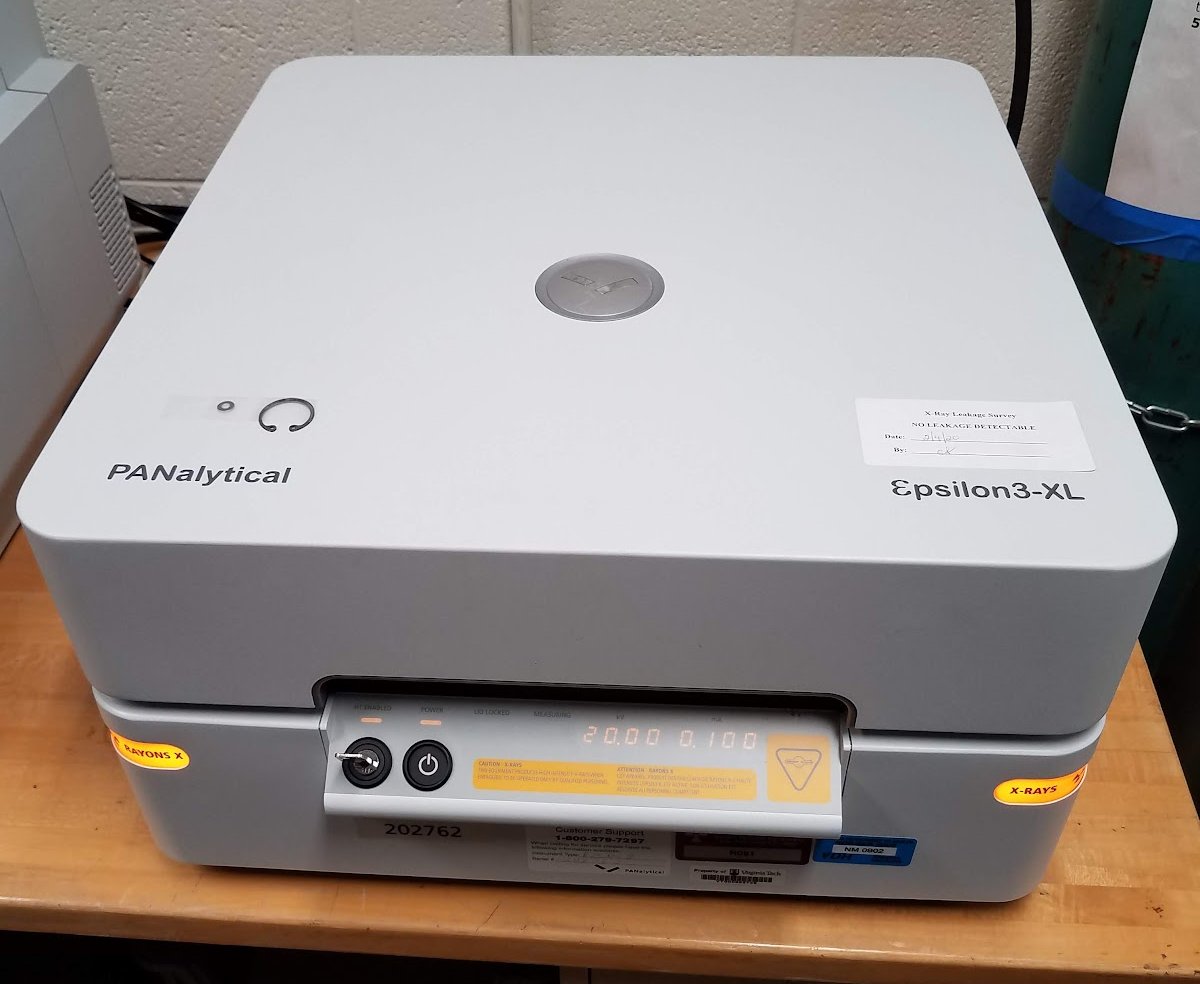 The Epsilon 3 XL bench top x-ray fluorescence spectrometer performs quantitative bulk chemical analysis of rock powders, soils, fused glass beads, rock hand samples, and air filters. It is equipped with a 15 W (20 kV) Rhodium X-ray tube, a solid-state energy-dispersive spectrometer (EDS), a 10-position computer-controlled sample tray, rotating sample wells, and a high-resolution silicon drift detector (SDD). The system also includes a high-sensitivity beryllium window and a helium gas atmosphere for light element analysis.